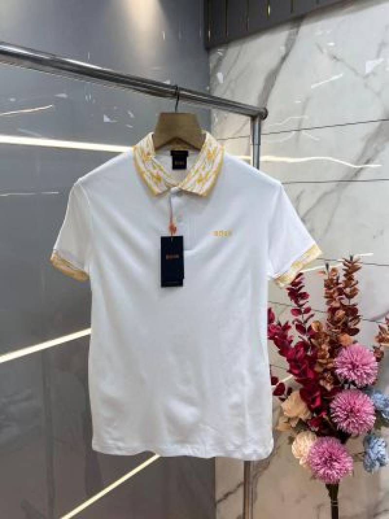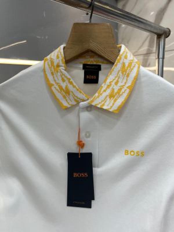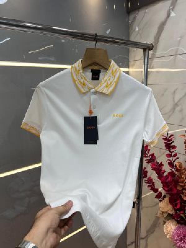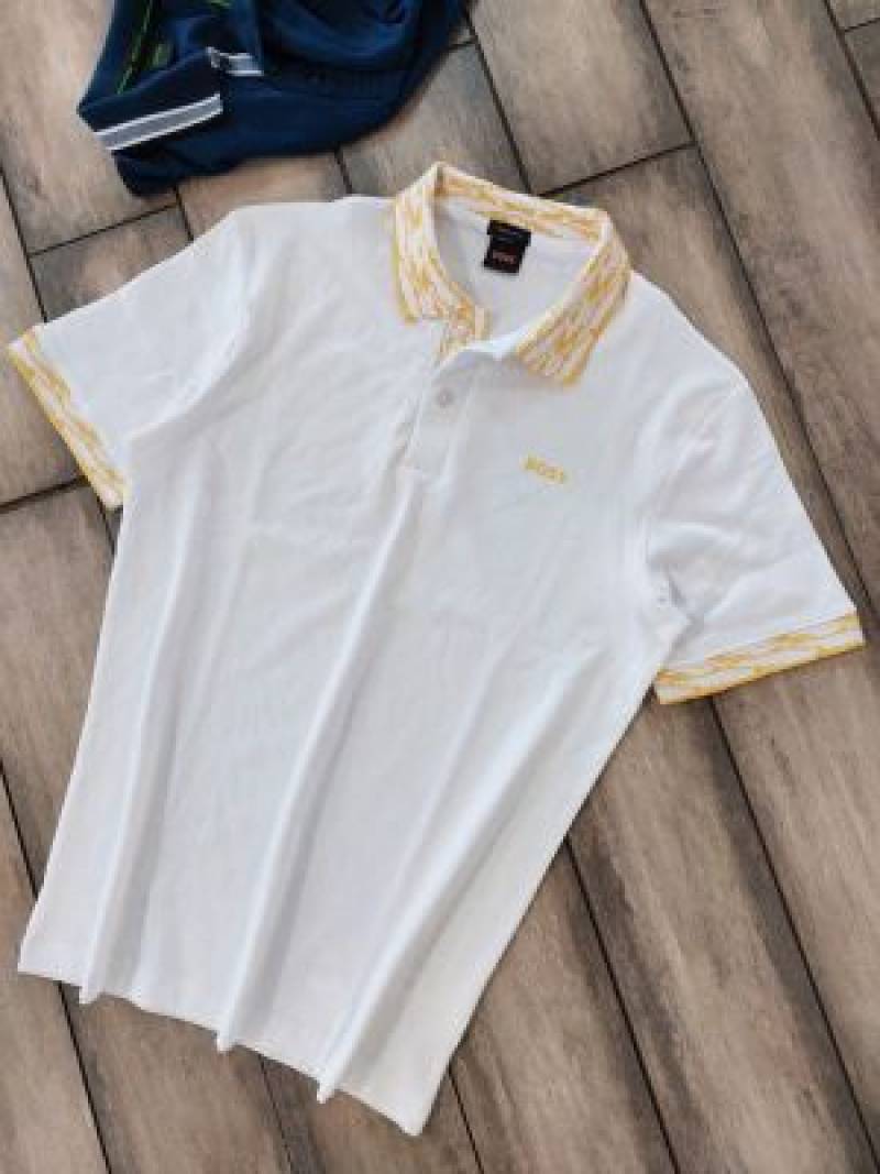 Hugo Bos s White Premium Imported Compact Yarn 240 GSM Interlock Fabric Polo Tshirt with Collar Design and Emboss Logo 3352